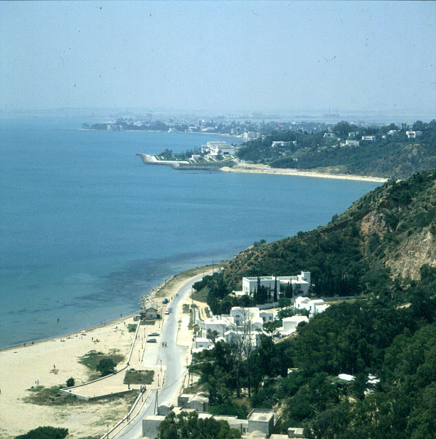 Blick von Sidi Bou Said zu einem der Paläste von Präs. Bourghiba